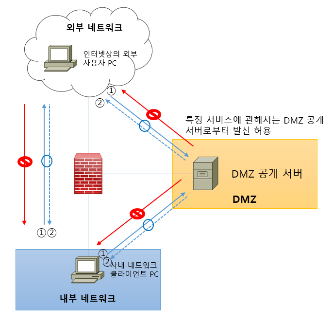 내부 네트워크, 외부 네트워크, DMZ 상에서 발생하는 트래픽은 일반적으로 아래의 흐름을 따른다.