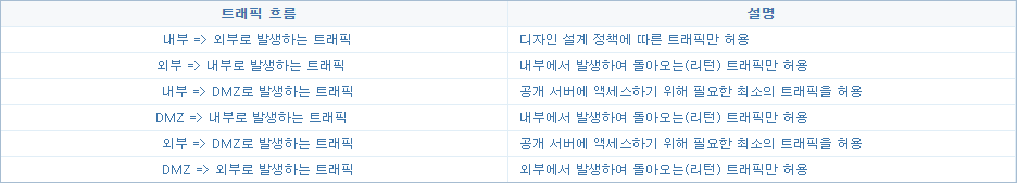 - 방화벽의 기본 기능으로 외부에서 발생되는 트래픽은 차단되며, 내부에서 외부로 발생된 트래픽의 반환(리턴)은 허용합니다.