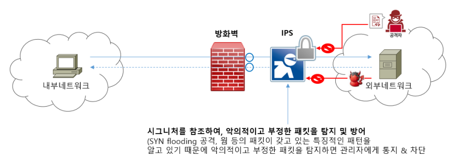 - IPS는 이름에서 보듯이, 부정한 액세스 등의 악의적인 트래픽을 검출하여 통보뿐만 아니라 시그니처를 참조하여 부정한 액세스에 해당하는 패킷을 차단하거나 세션을 끊어 즉시 방어한다.