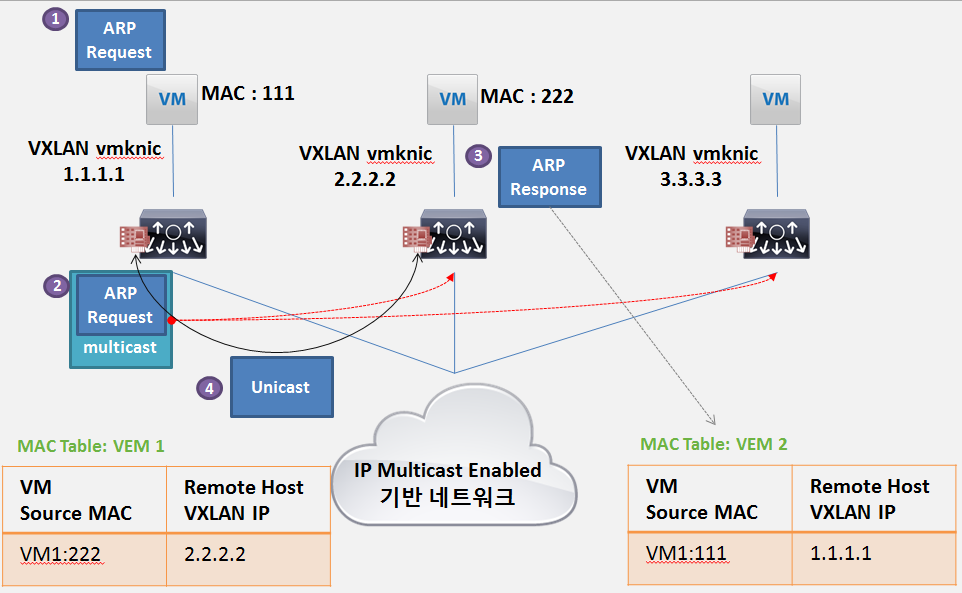 - ARP Request는 vSwitch의 MAC 테이블에도 정보가 없어 VTEP Multicast Bust를 통해 ARP Request를 전송한다.