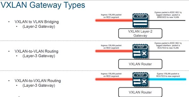 - L3 VxLAN-to-VLAN Routing : A에서 VxLAN Gateway까지 도달한 뒤 그 이후 B까지는 VxLAN이 아닌 다른 라우팅 정보를 통해 B로 라우팅