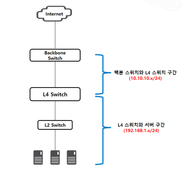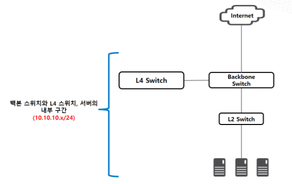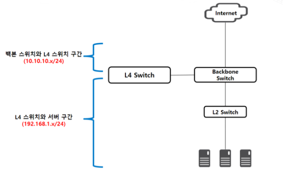 서버, L4 스위치, 백본 스위치가 동일한 IP 대역을 갖고 있습니다.