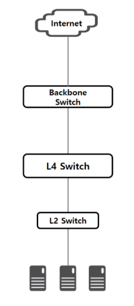 L2 스위치는 그저 스위칭 허브의 역할만을 하므로 큰 의미는 없습니다. 외부에서 들어온 요청은 백본 스위치를 거쳐 L4 스위치에 도달하며 L4 스위치는 이를 하위 서버에 부하 분산합니다.
