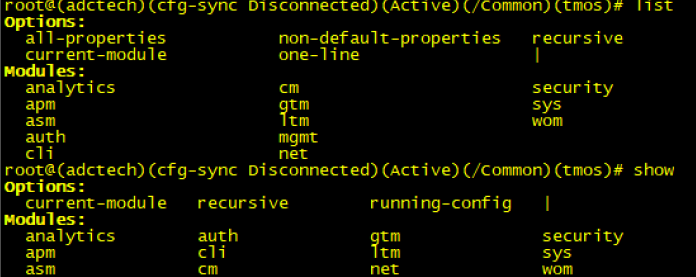 - TMSH는 모든 configuration을 생성/삭제/수정이 가능 하며 세부적인 옵션으로 설정보기도 가능하다.