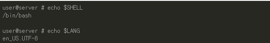 - echo 명령어를 이용하여 user 계정이 사용하는 shell 정보 및 인코딩 정보 등 지정된 다양한 환경변수를 확인할 수 있다.