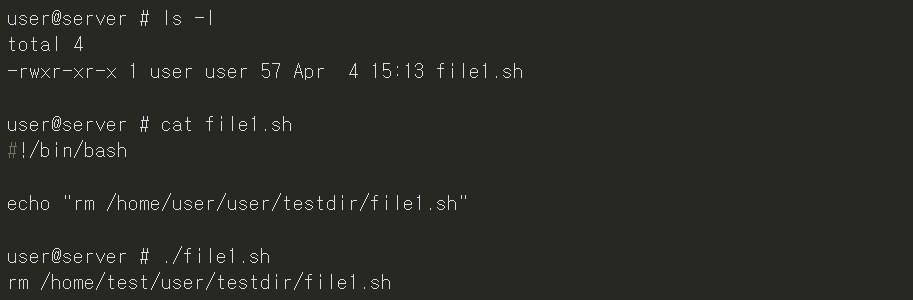 실제로 실행하면 rm 명령어가 실행되는 것이 아닌 echo 명령어가 실행되고 rm 명령 라인은 텍스트로 출력된다.