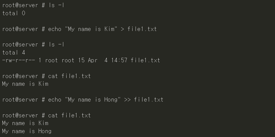 - echo "내용" > > {파일명}